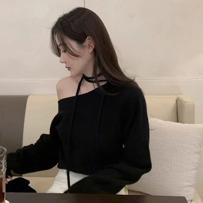Long-Sleeve Cold Shoulder Plain Knit Top