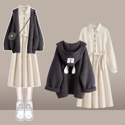 Bear Ears Hooded Cardigan Sweater Belted Lapel Dress