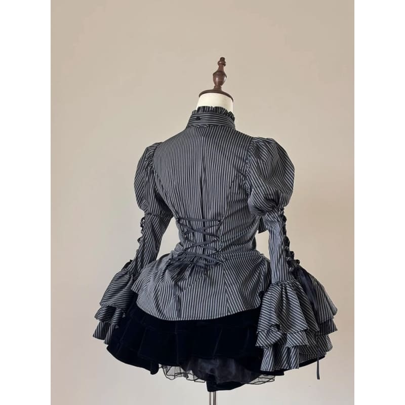 Black Collar Lace-up Lolita Long Sleeves Striped Shirt