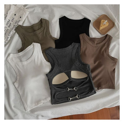 Round Neck Plain Cutout Back Padded Tank Top - Gray