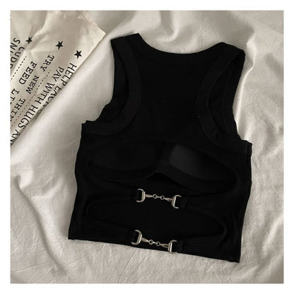 Round Neck Plain Cutout Back Padded Tank Top - Black