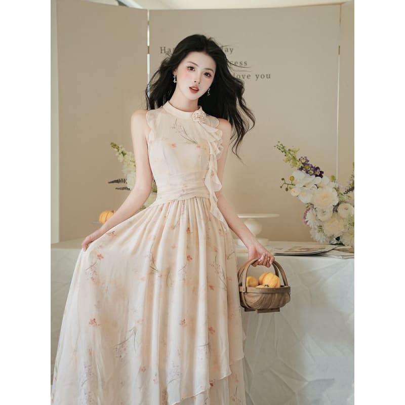 Sleeveless Mock Neck Floral Ruffle Trim Midi A
