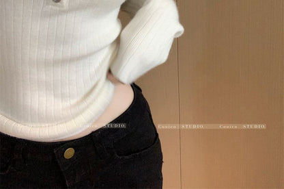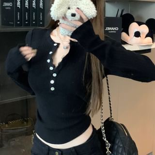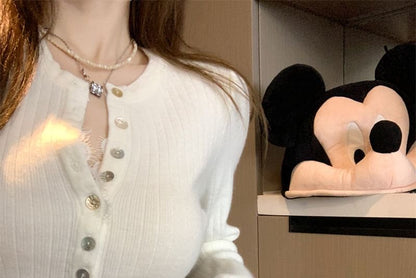 Long-Sleeve Crew Neck Plain Lace Trim Half-Buttoned Slim Fit Crop Knit Top