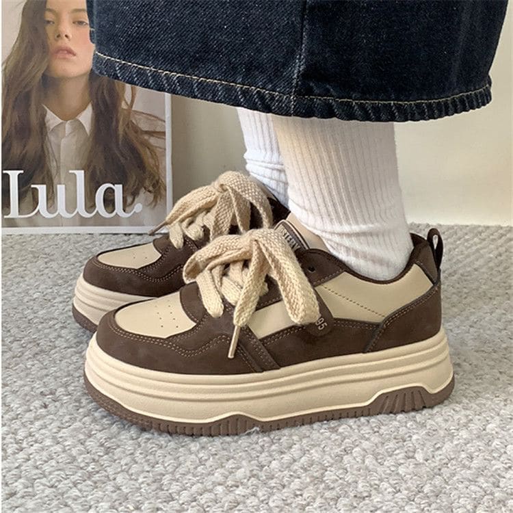 Two Tone Lettering Platform Sneakers - Khaki / 35