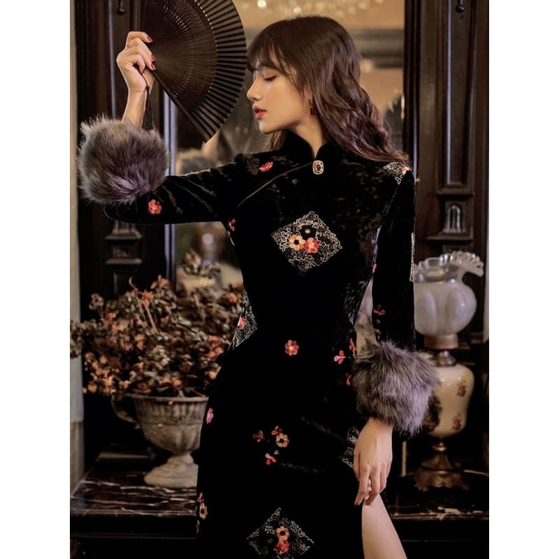 This elegant cheongsam features luxurious black fur sleeves that add a touch of sophistication. Its long length provides coverage and the perfect amount of flow for a graceful appearance. You'll feel confident and elegant in this statement piece.
