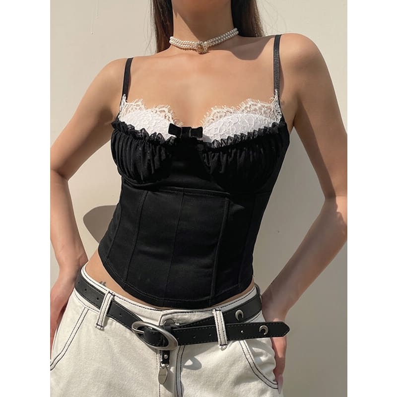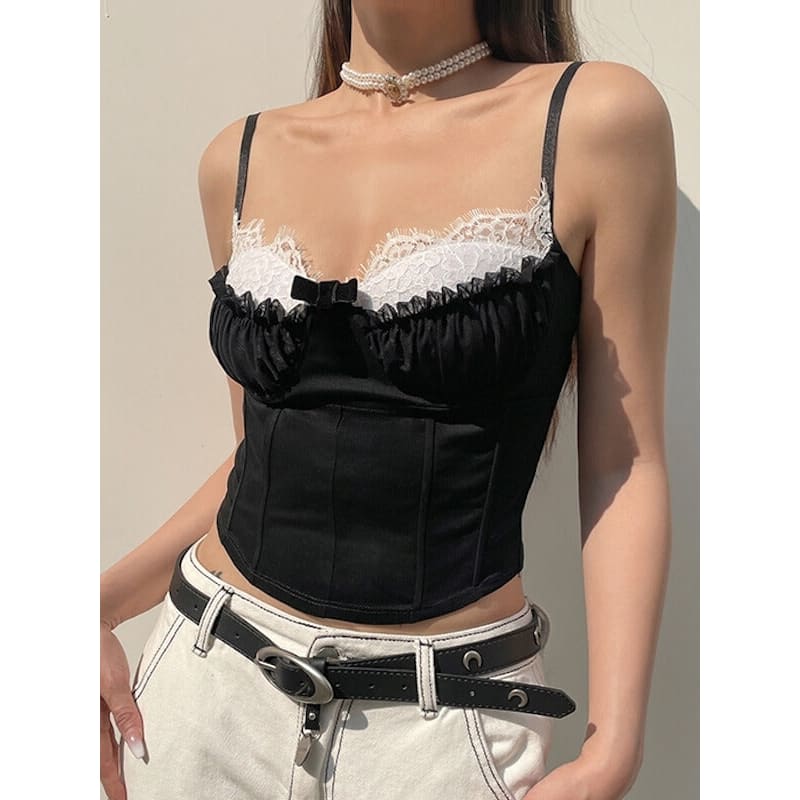 This cute Black with White Lace Camisole is perfect for adding a touch of kawaii to your wardrobe. The contrasting lace adds a feminine and charming touch to the classic black color. Wear it on its own or layer it under your favorite tops for a versatile and stylish look.