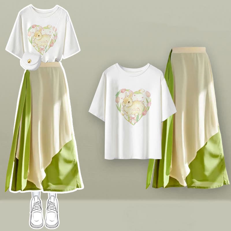 Cartoon Green Letter Print T-Shirt Chiffon Wide-Leg Pants