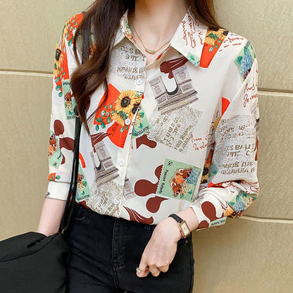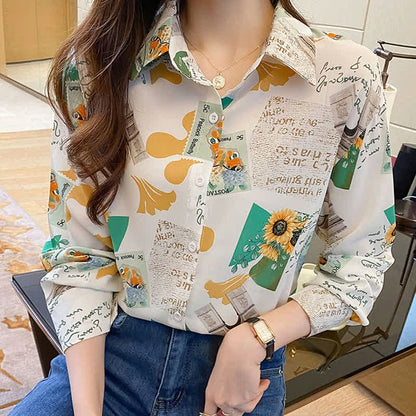 Chic Floral Letter Print Chiffon Shirt Workwear