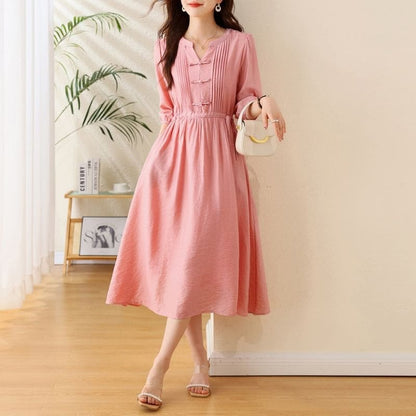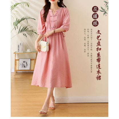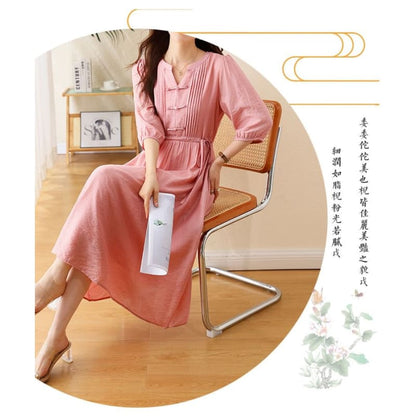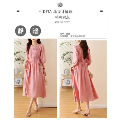 Elbow-Sleeve Notch Neck Plain Bowknot Midi A-Line Dress