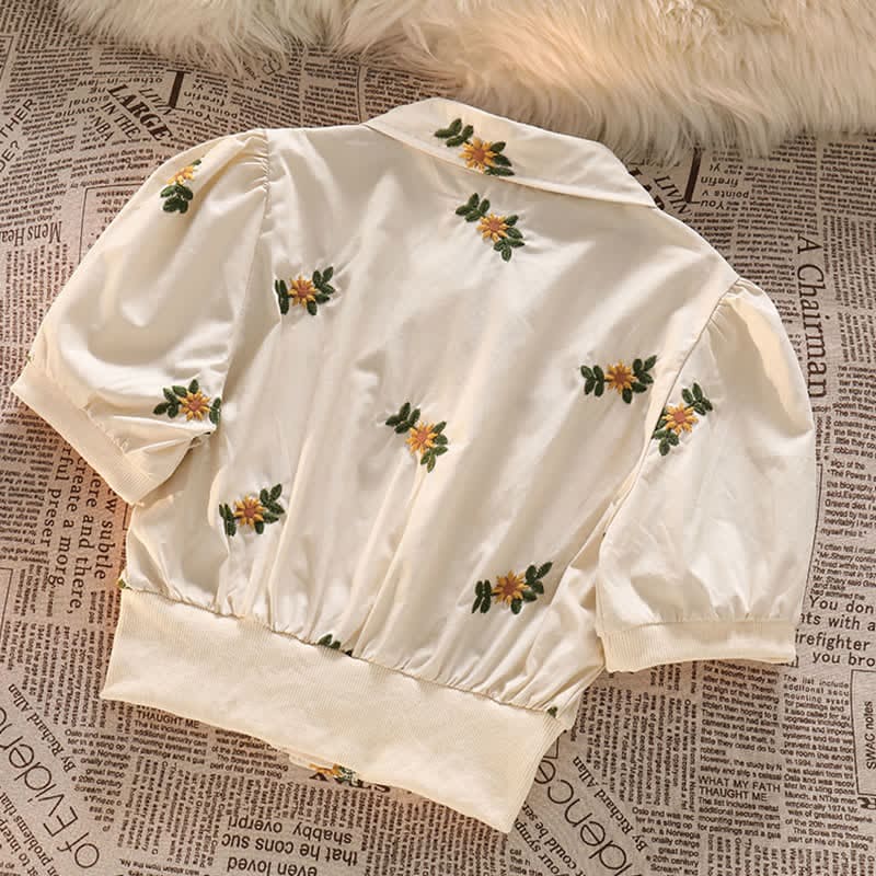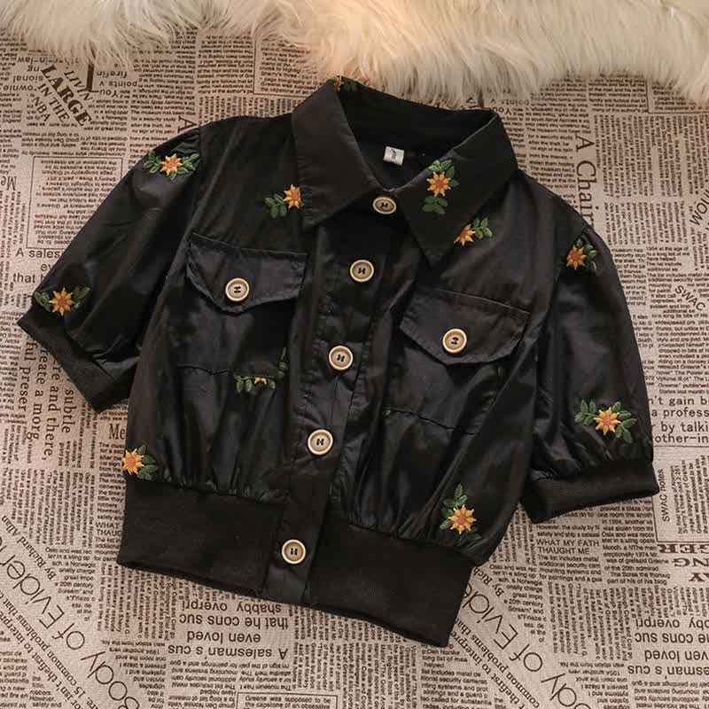 Floral Embroidery Lapel Pocket T-Shirt Long Skirt