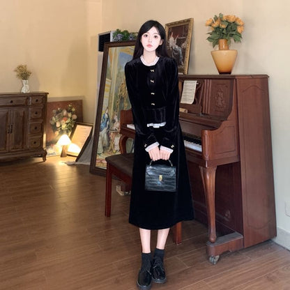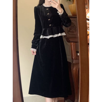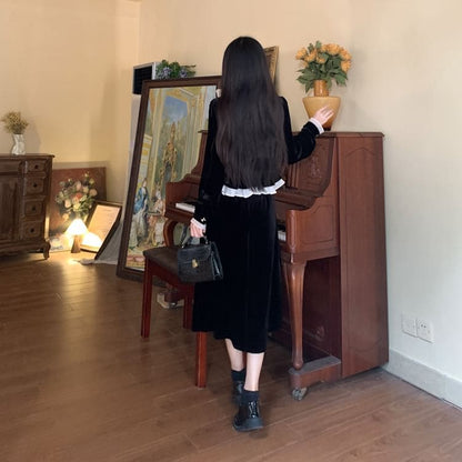 Long Sleeve Band Collar Ruffle Hem Velvet Midi A-Line Dress