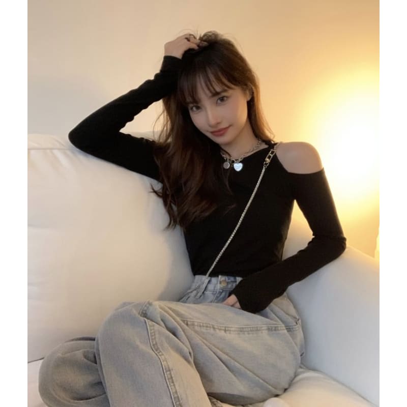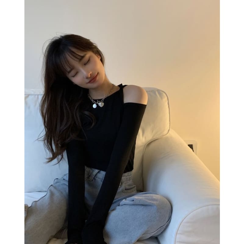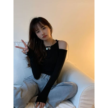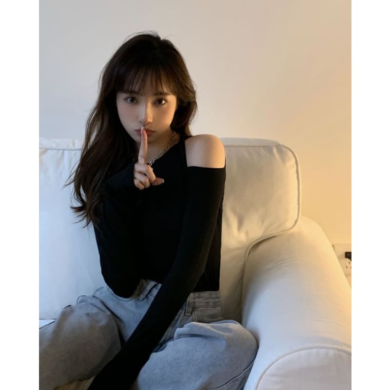 Long-Sleeve Cold Shoulder Plain Top - Clothing