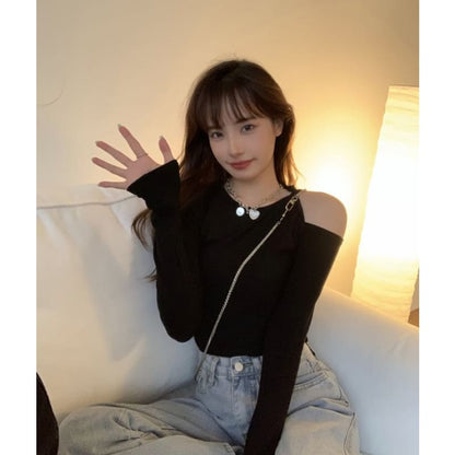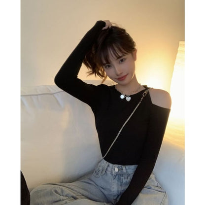 Long-Sleeve Cold Shoulder Plain Top - Black / M - Clothing