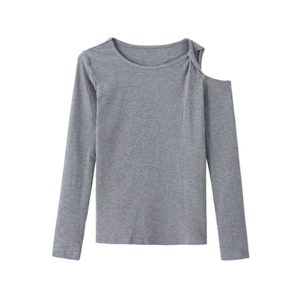 Long-Sleeve Cold Shoulder Plain Top - Gray / M - Clothing