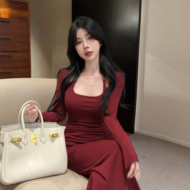 Long-Sleeve Halter Plain Maxi Mermaid Dress