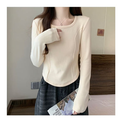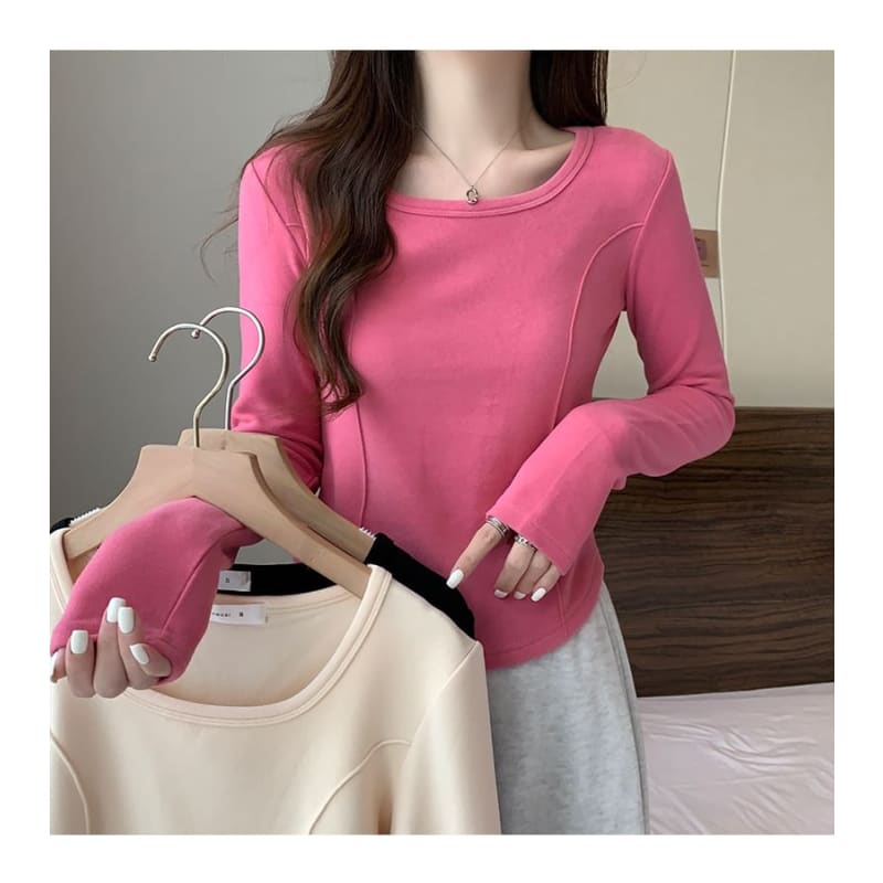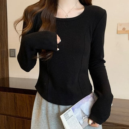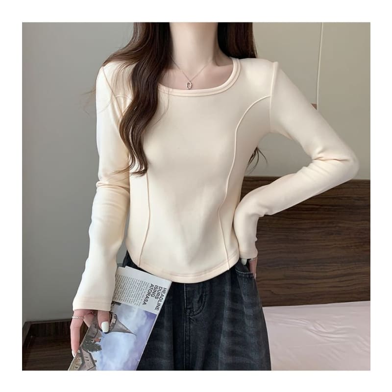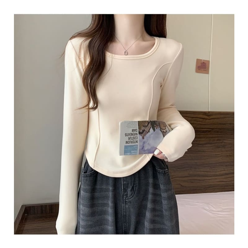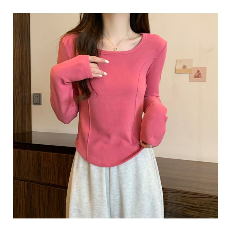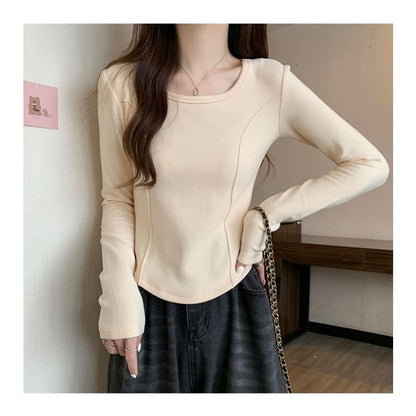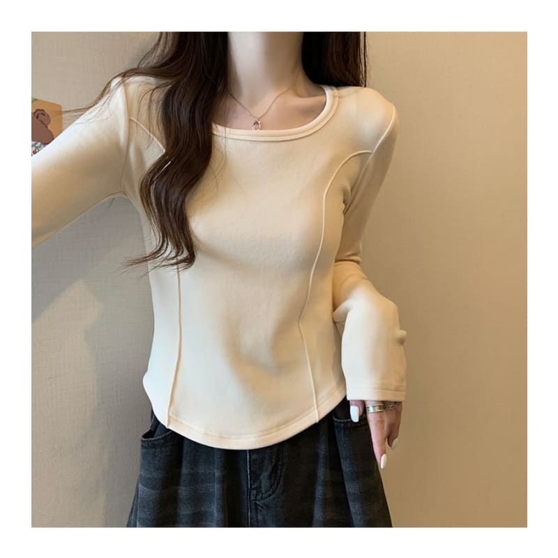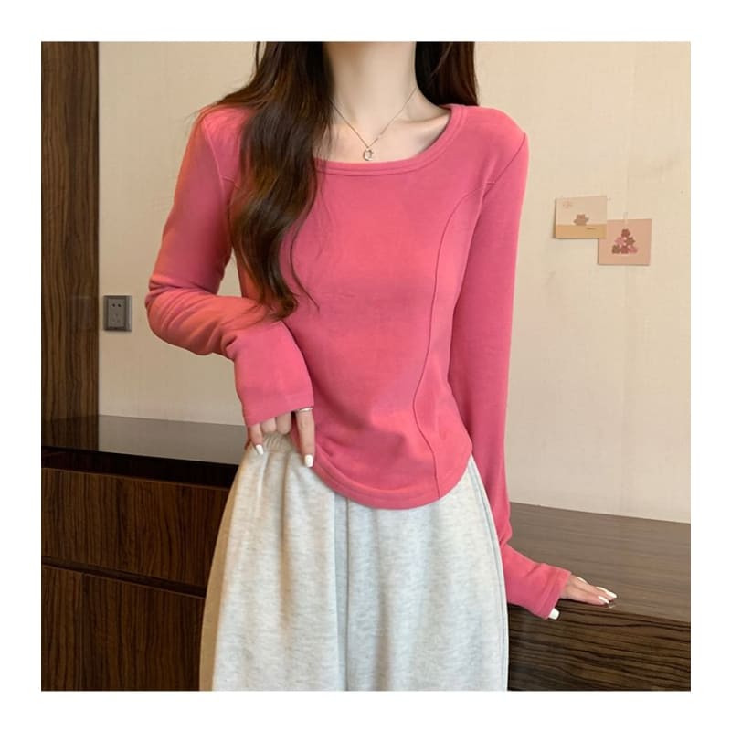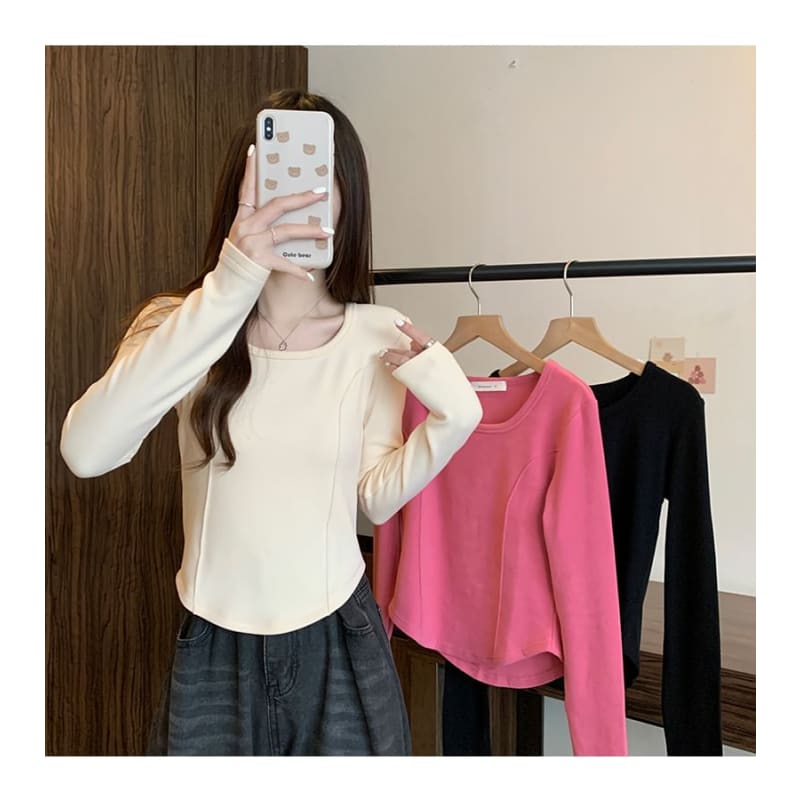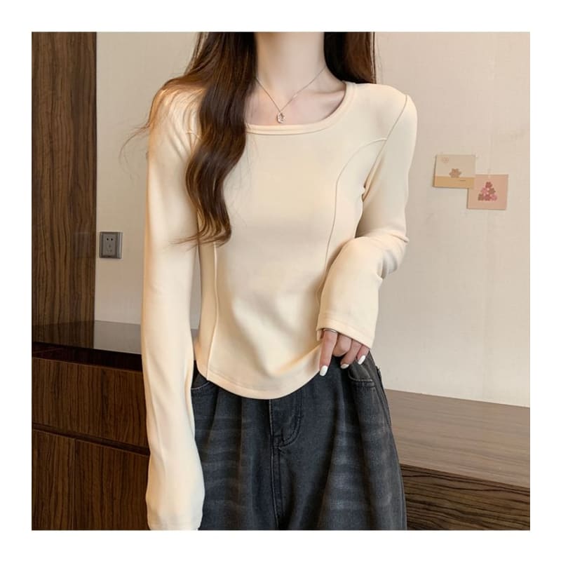 Long-Sleeve Square Neck Plain T-Shirt - Clothing