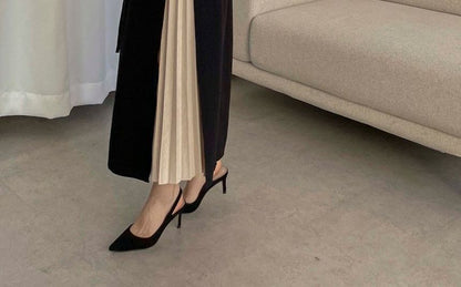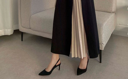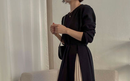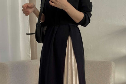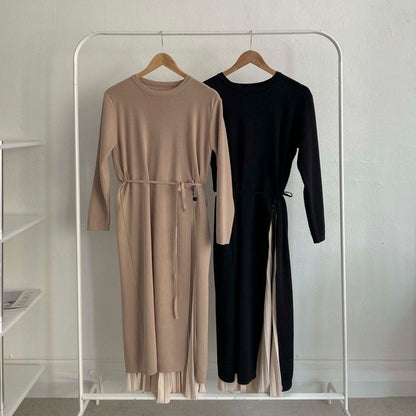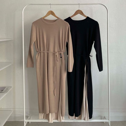 Mock Two-Piece Long-Sleeve Pleated Panel Midi A-Line Knit Dress