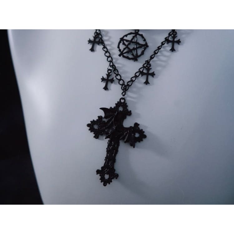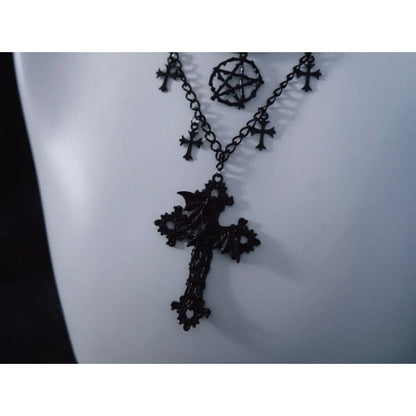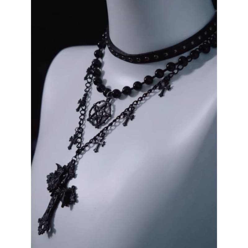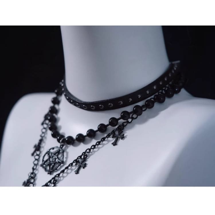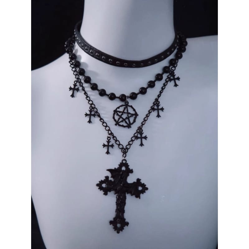 Pentagram Cross Pendant Black Triple Layered Necklace