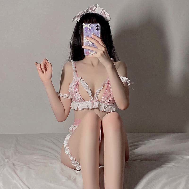 Pink Maid Bow Knot Lace Hollow Out Bikini Lingerie