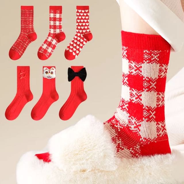 Printed Socks / Set - Type 11 - 1 Pair - Plaid - Red
