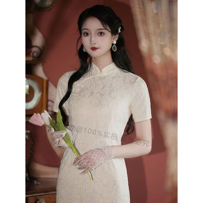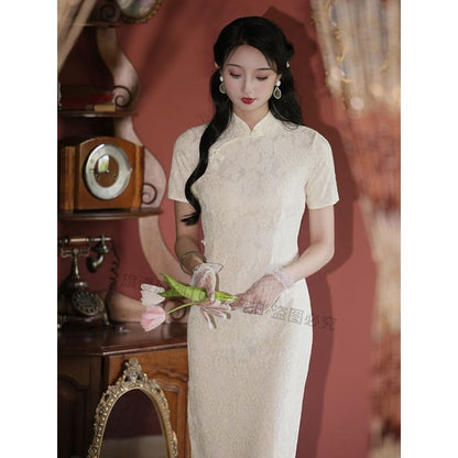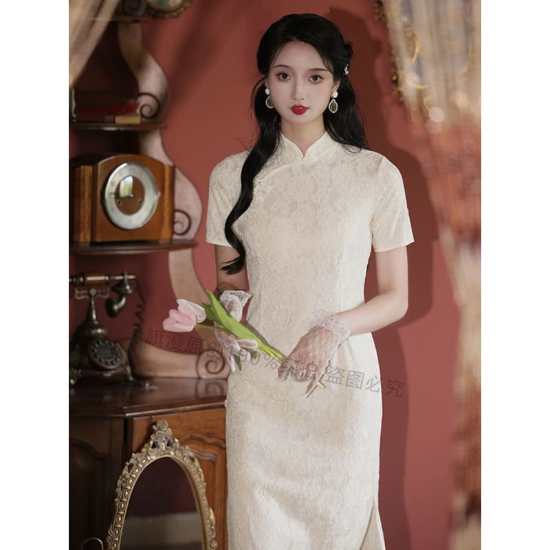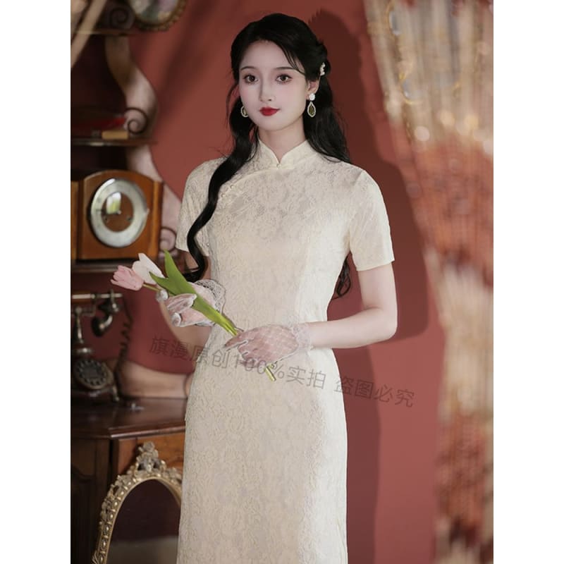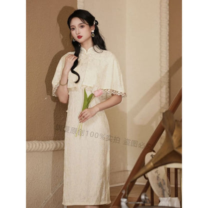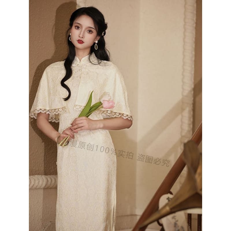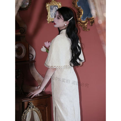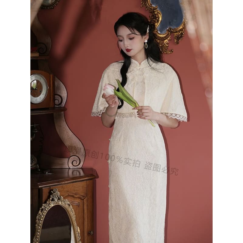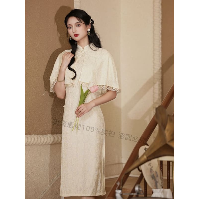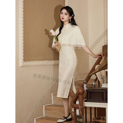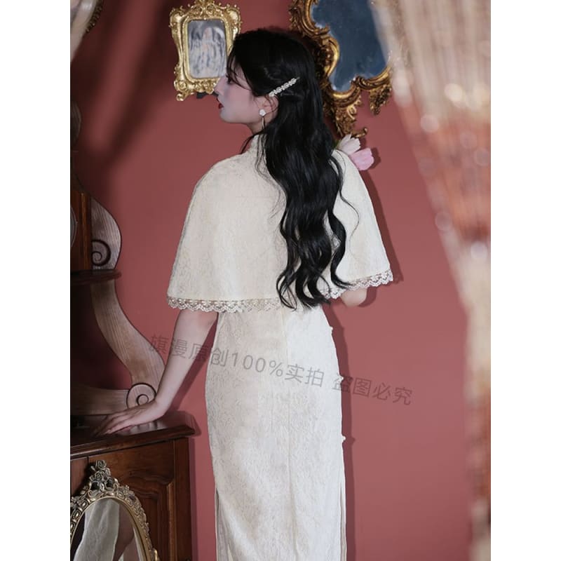 Set: Halter-Neck Slit Midi Lace Qipao + Lace Trim Cape