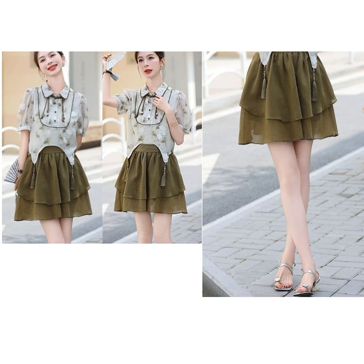 Set: Short-Sleeve Floral Asymmetrical Cropped Frog Button Blouse + Elastic Waist Mini A-Line Skirt