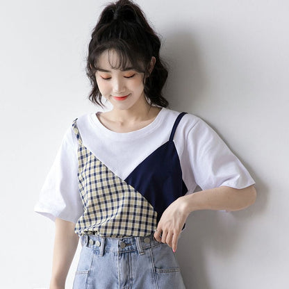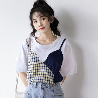 Sweet Plaid Color Block Fake Two Piece T-Shirt