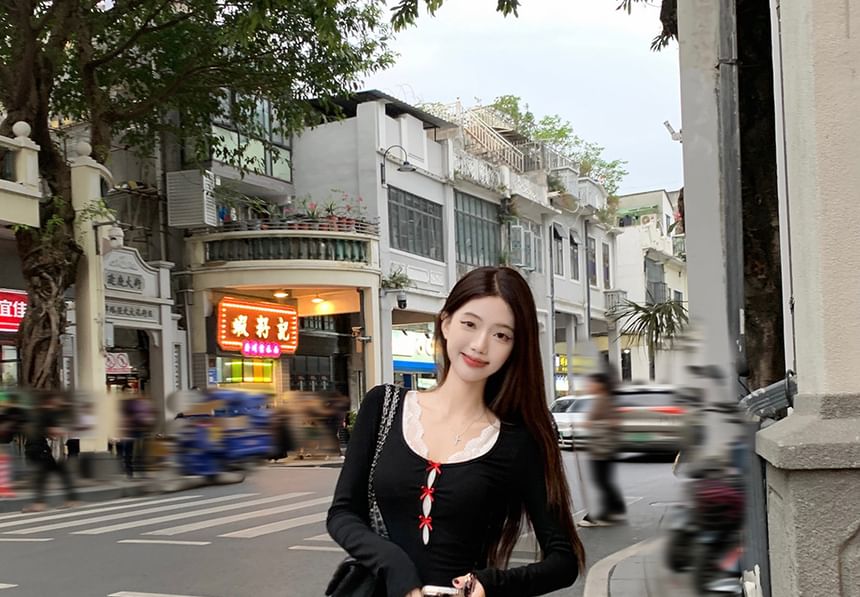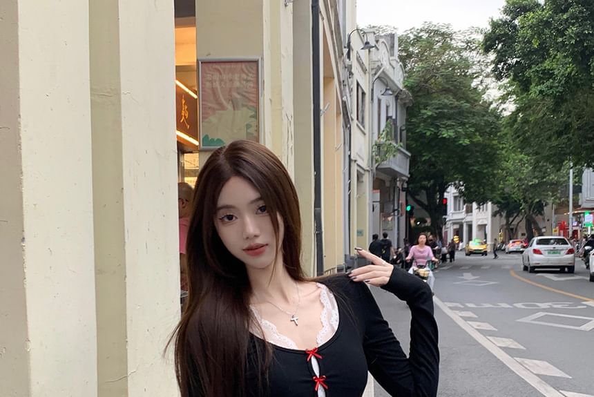 V-Neck Lace Crop Tank Top / Long-Sleeve Scoop Neck Plain Bow Accent Cutout Maxi Mermaid Dress